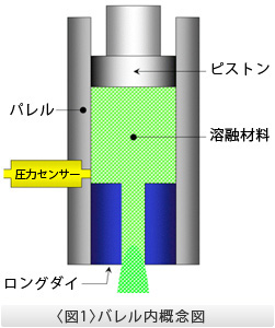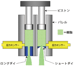 2)溶融した材料はピストンがある一定スピードで押し下げられる事によって、下側のダイスを通して押し出されます。この時、溶融物の圧力をダイスの入り口近くに設置された圧力センサーでモニターします。