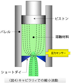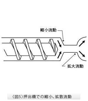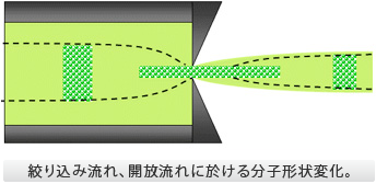 溶融ポリマーが押出機或は射出成形機からダイ(金型)に押し込まれる時、必ず絞り込み流れが生じます。特に絞り込み流れになる時には流れの加速度が増加し、強い伸張流動となります。