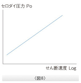 ○図.8はゼロ長のダイで得られる縮小流動と拡散流動に関わる圧力(P0)-せん断速度(Γ)の相関グラフ。