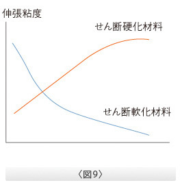 ○図.9は縮小流動、拡散流動に関わる伸張粘度のグラフの例。