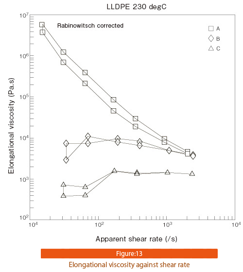 The【Figure13】is elongational viscosity plotted against shear rate.