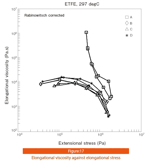 The【Figure14】is the one of elongational viscosity against elongational stress.