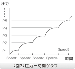 測定の結果、右図のような圧力~時間(ピストン・スピード)の相関グラフが得られます。