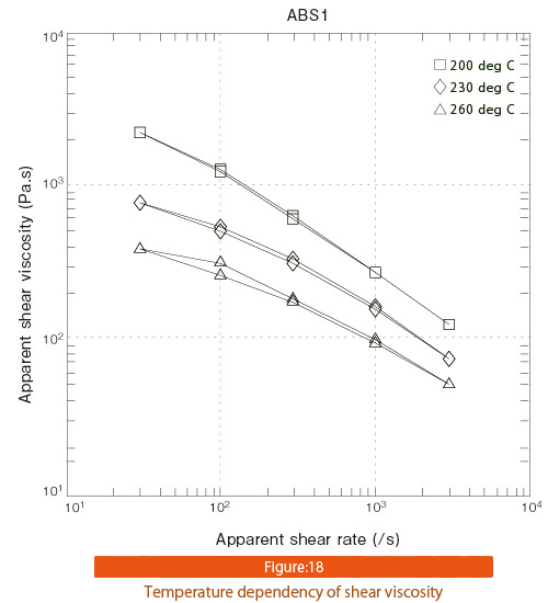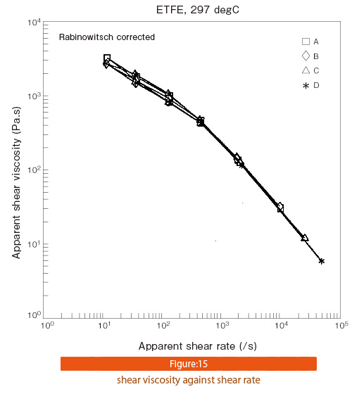 【Figure15】is the graph of shear viscosity plotted against shear rate. As we can see, the material manufacturer does a quite good quality control and the shear viscosity is the same in the measured shear rate range.