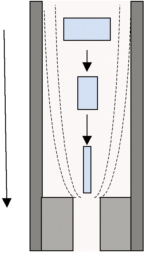 We calculate elongational viscosity out of the converging flow. Elongational viscosity is very sensitive to the structure of the material. And we can measure the elongational viscosity at the production speed of most of the process. The converging flow at the runner of the injection molding machine, bubble stability of the inflation molding, draw down of the parison of the blow molding, to name a few.